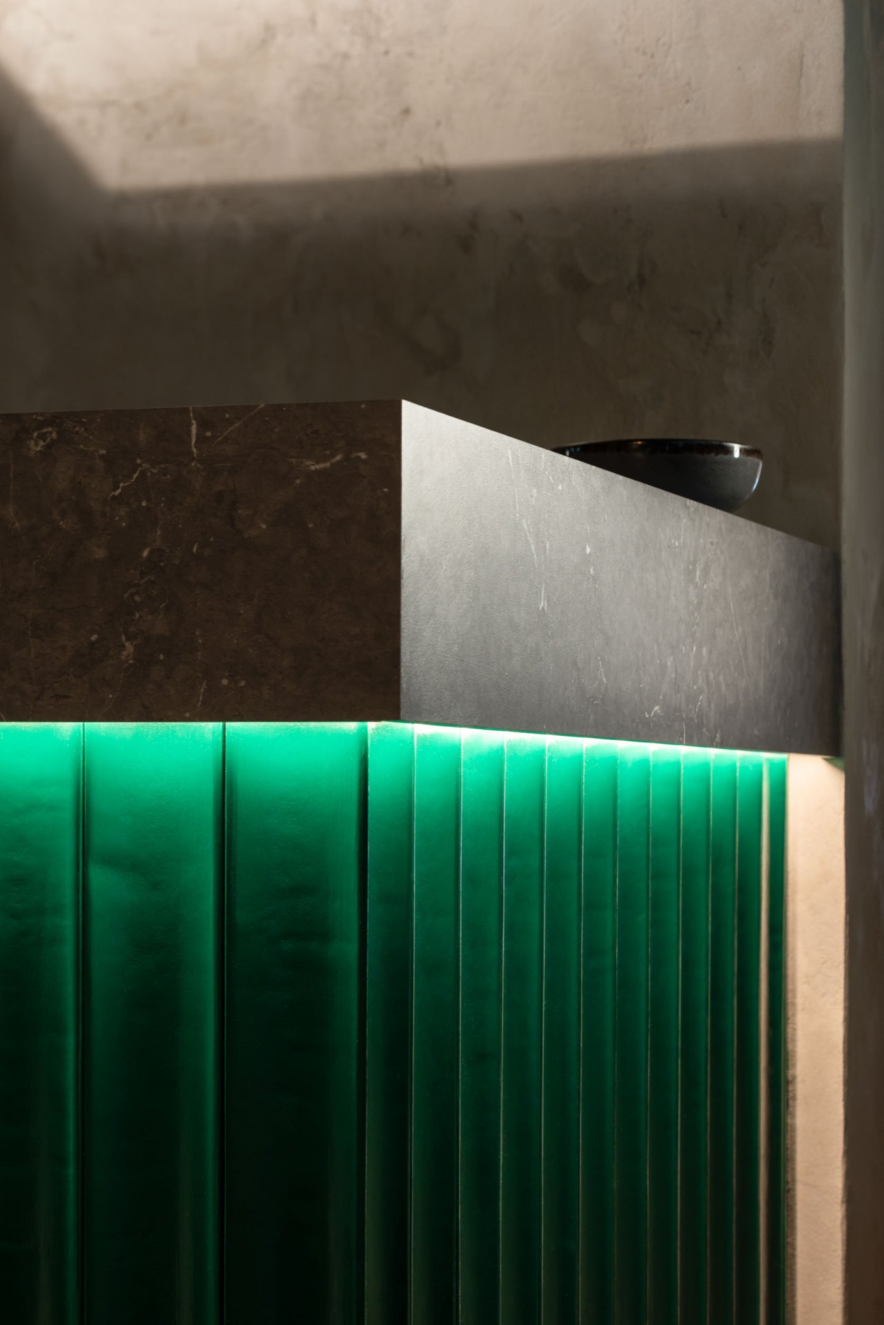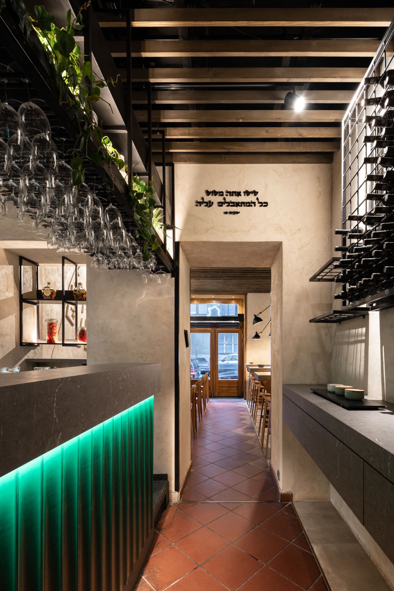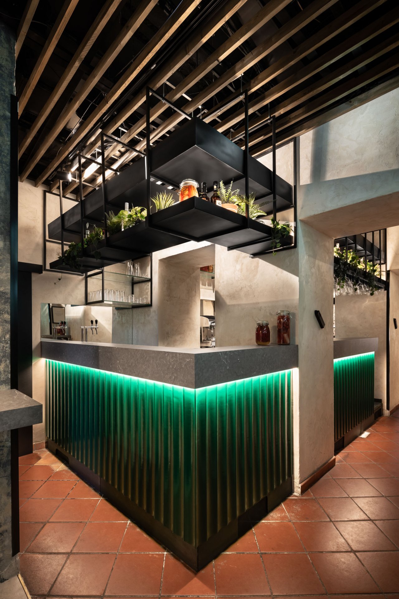 Dominantou prostoru je bar, který má profilovaný obklad lahvově zelené barvy. Nad barem byla navržená klecovitá konstrukce jako místo, kde je možné vystavit sklenice s fermentovanými domácími produkty. Zároveň je to místo pro zeleň, která barevně doplňuje obklad baru.