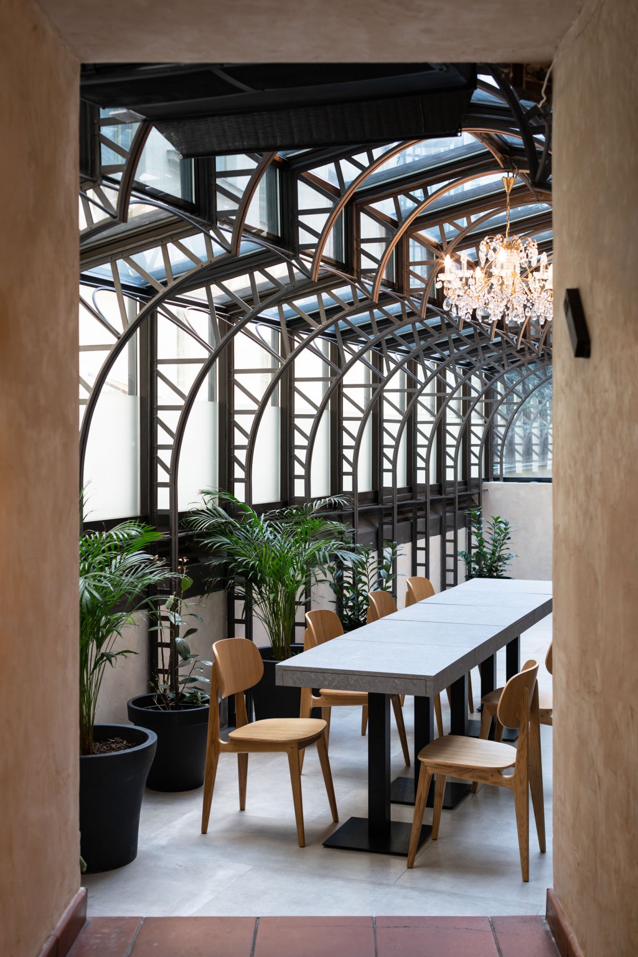 Po průchodu do zadní části restaurace může návštěvník obdivovat podsvětlené dobové fotografie původních ulic Josefova. Tam návštěvníka čeká překvapení v podobě atria, které patrně pochází z 30tých let 20.tého století. Jedná se o skleník nebo zimní zahradu, která je umístěna ve vnitrobloku domu a kde jsou umístěna další místa k sezení.
