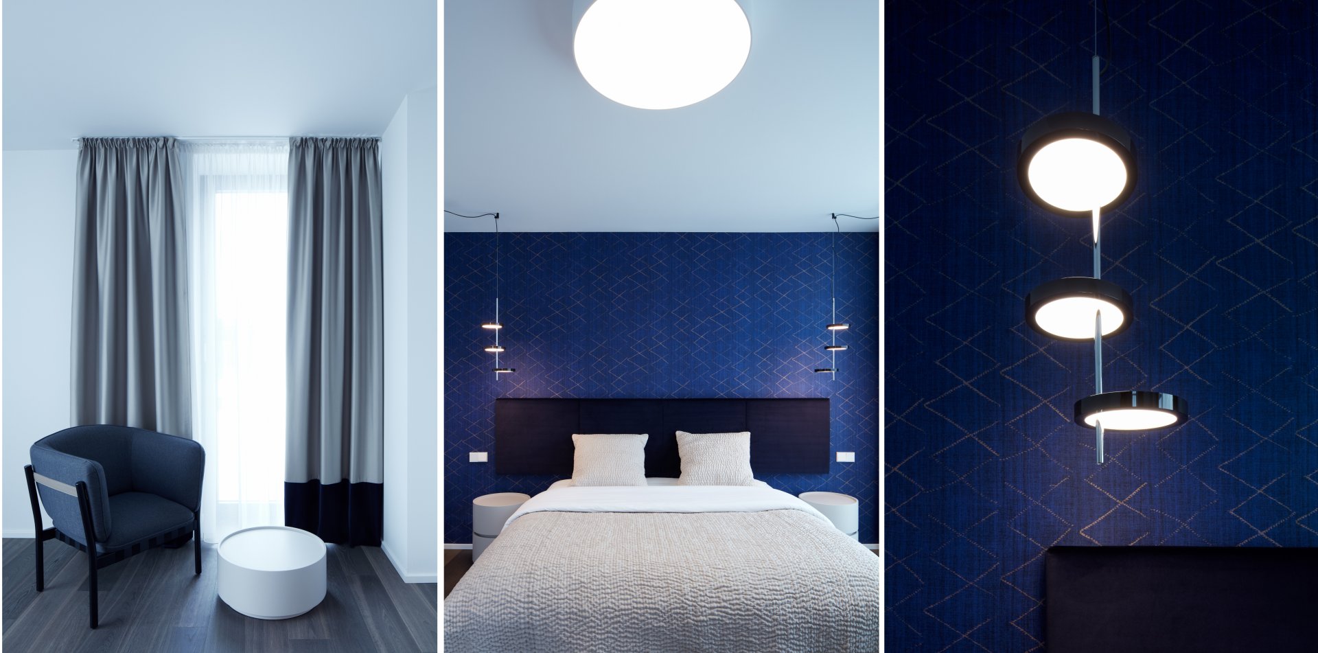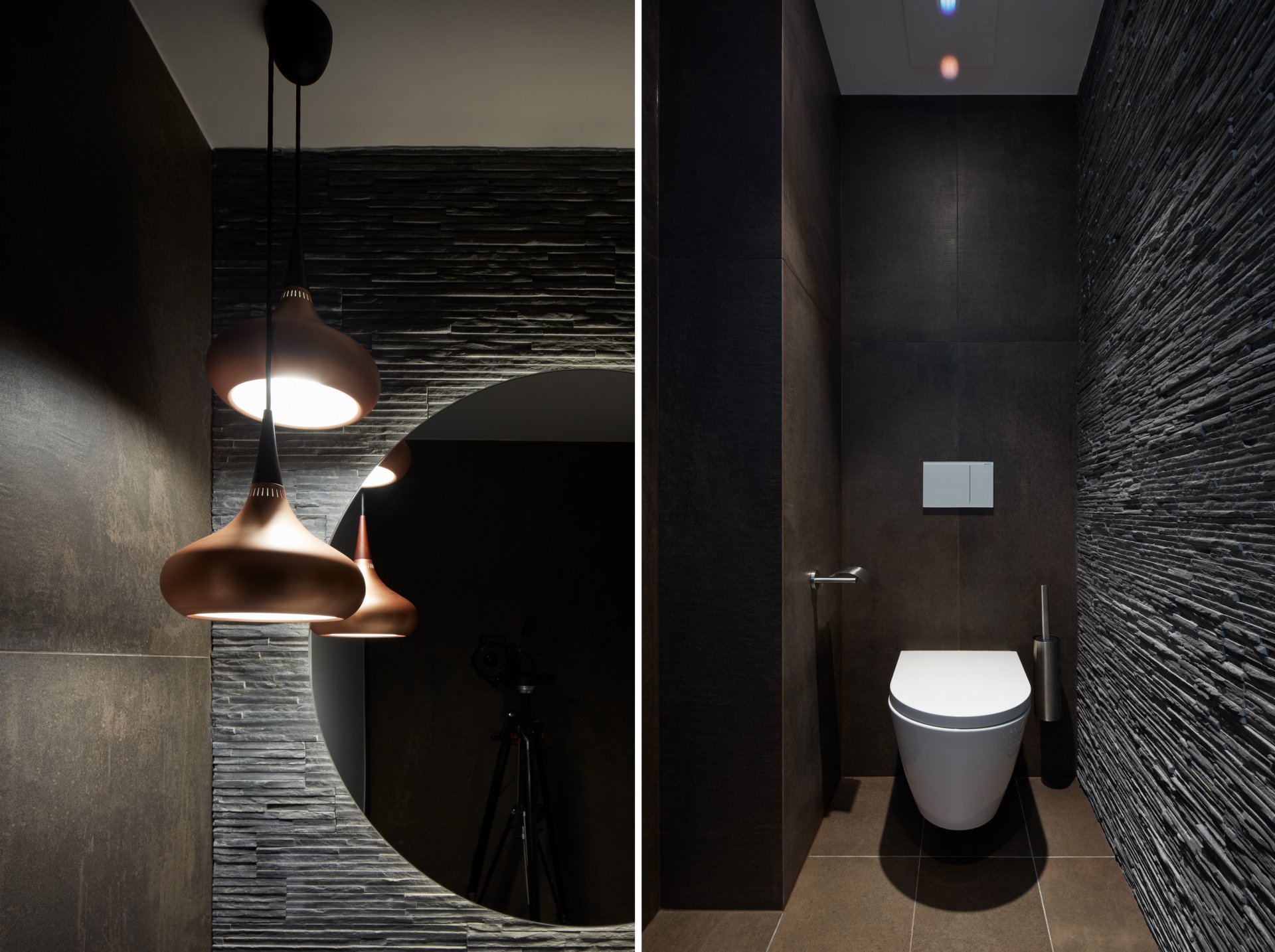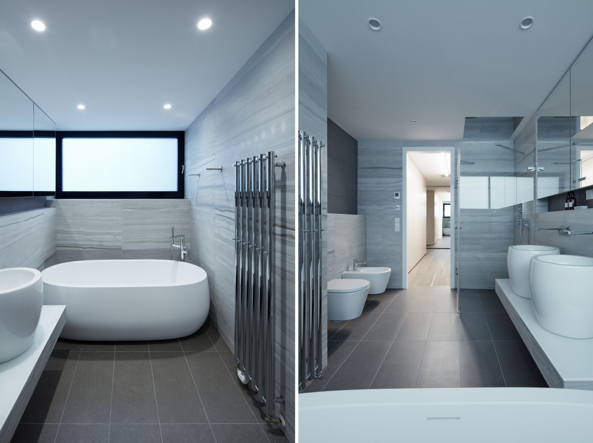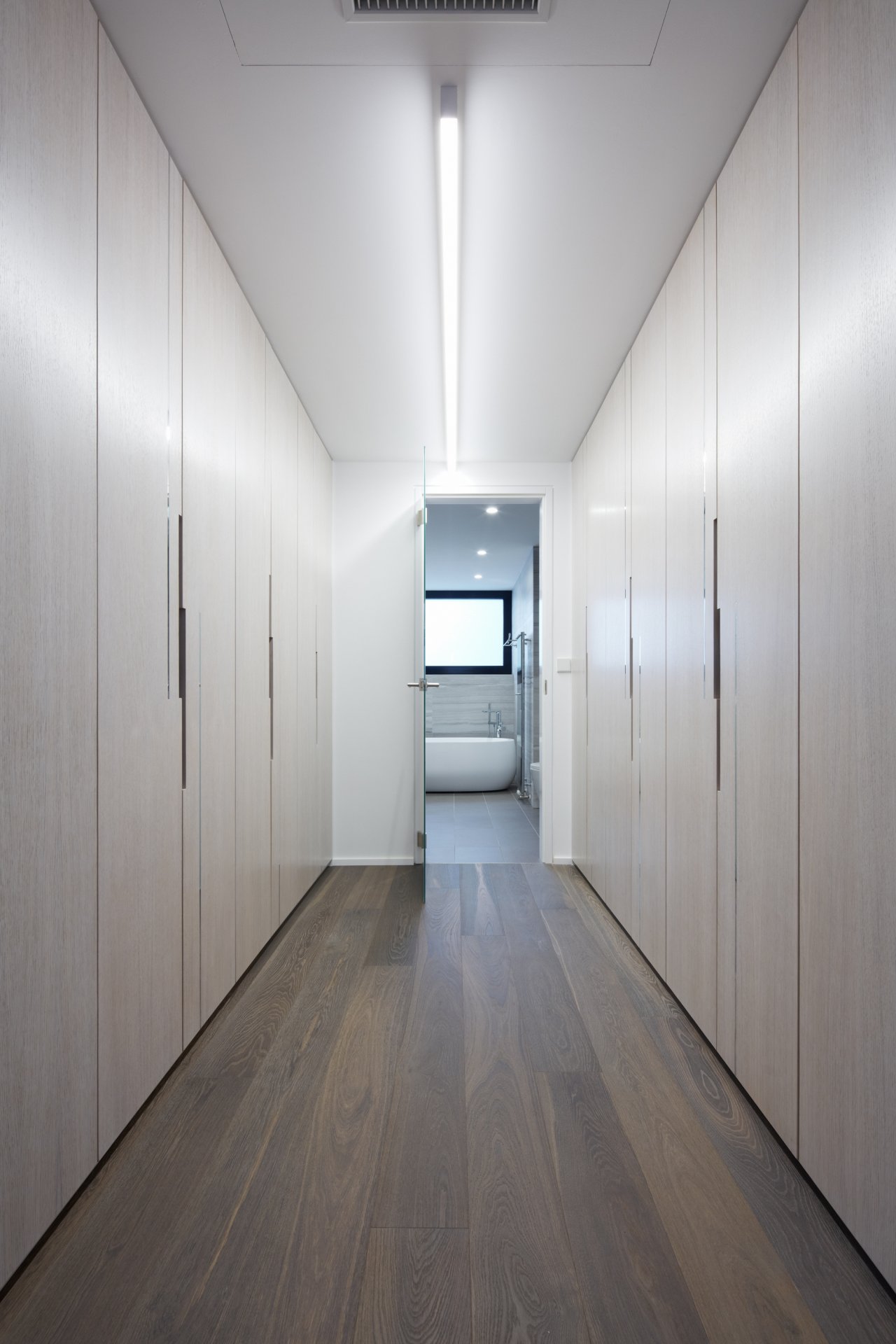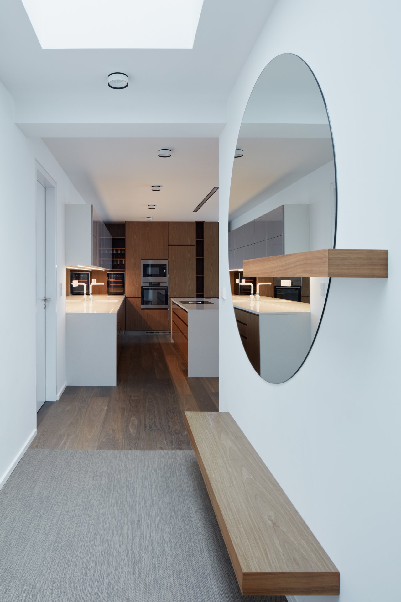 Toto jádro je v interiéru zdůrazněno tmavou stěrkou a tvoří centrální pilíř bytu, okolo které dispozice volně plyne.