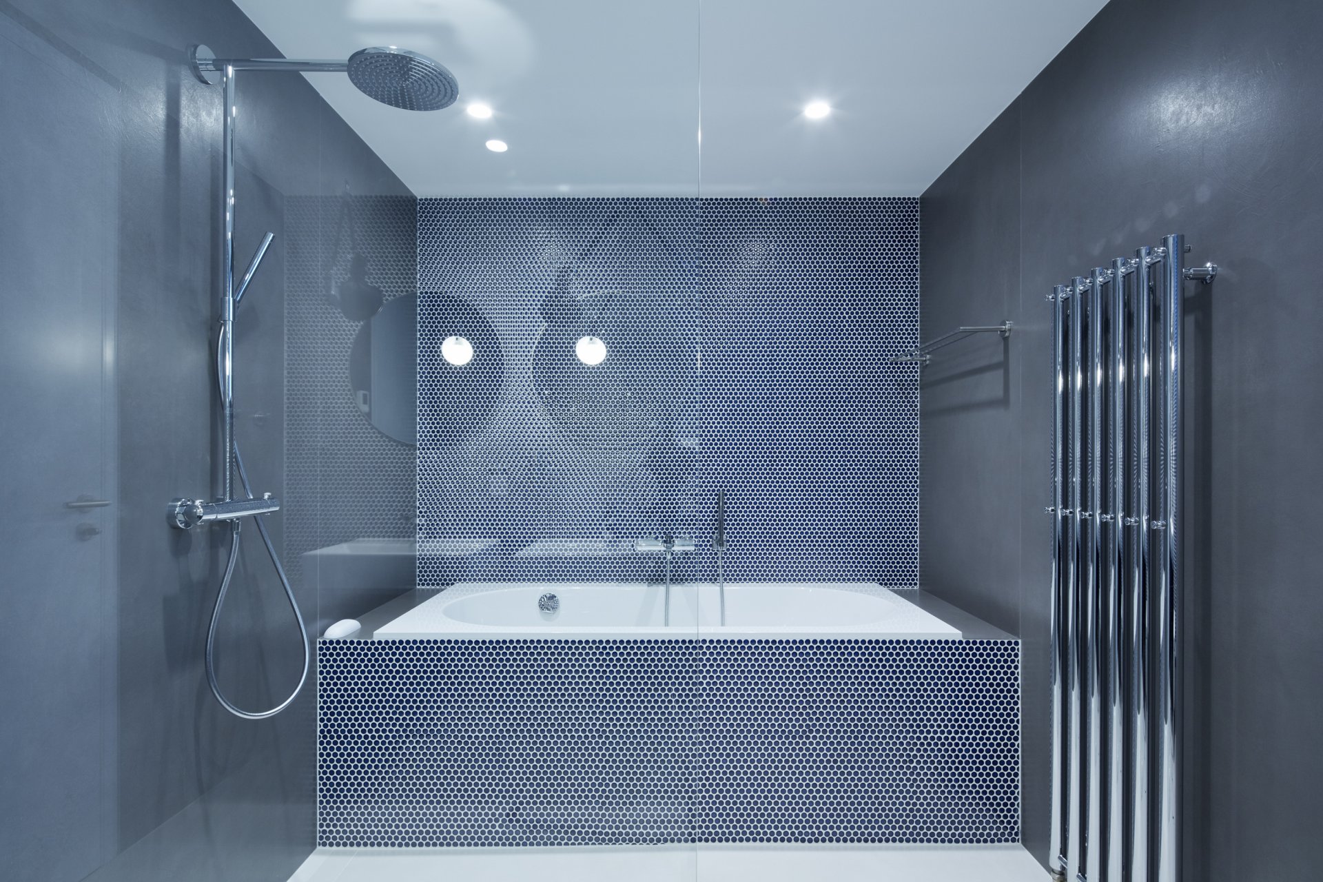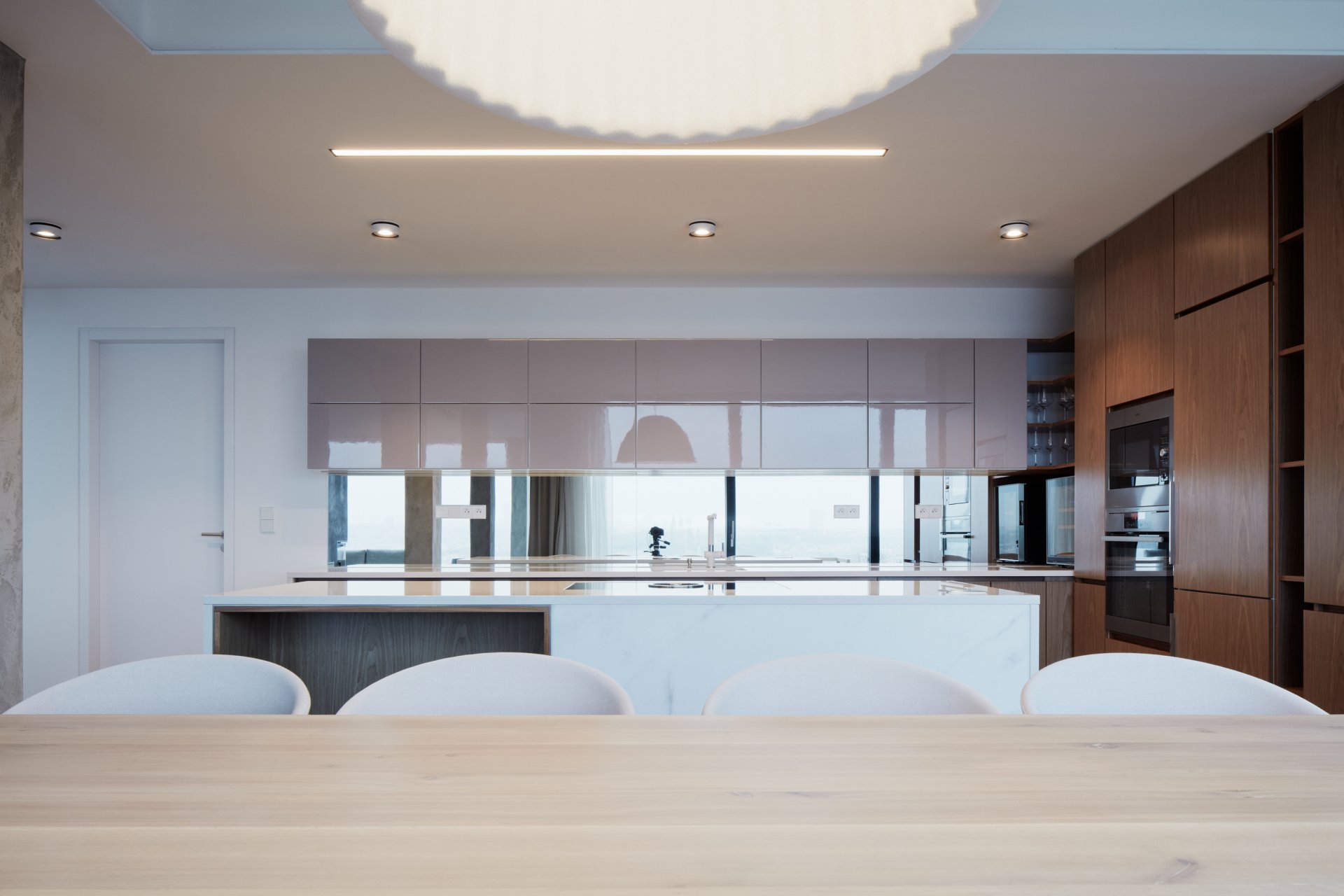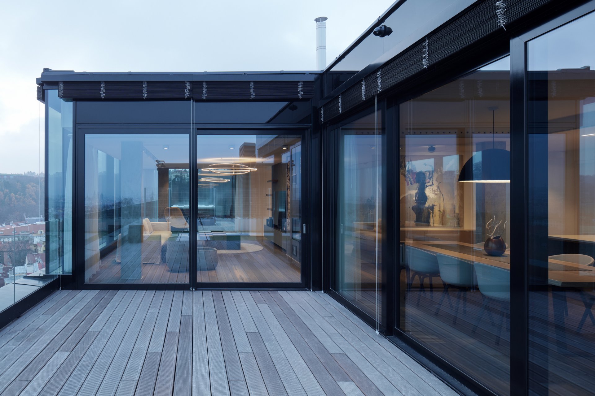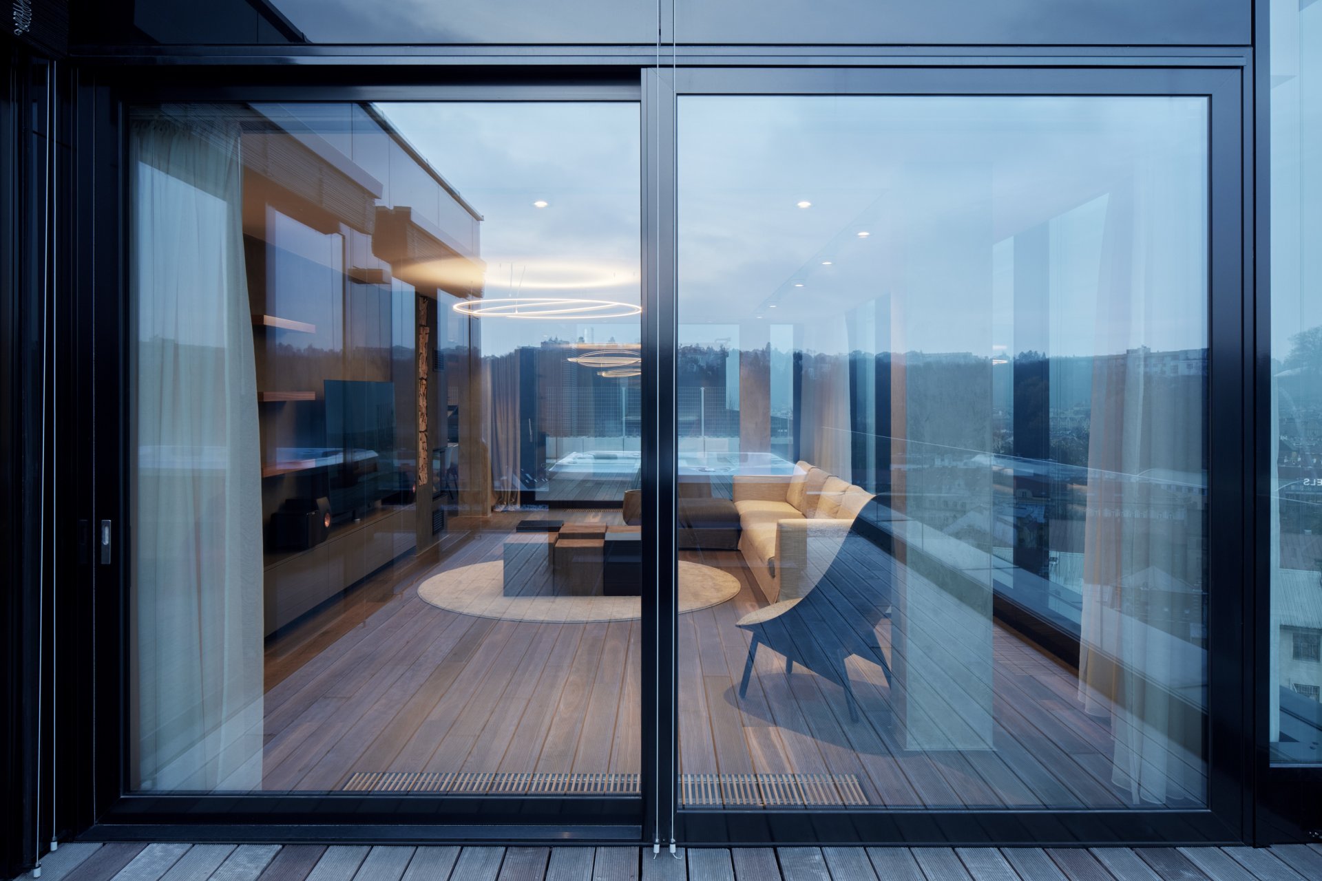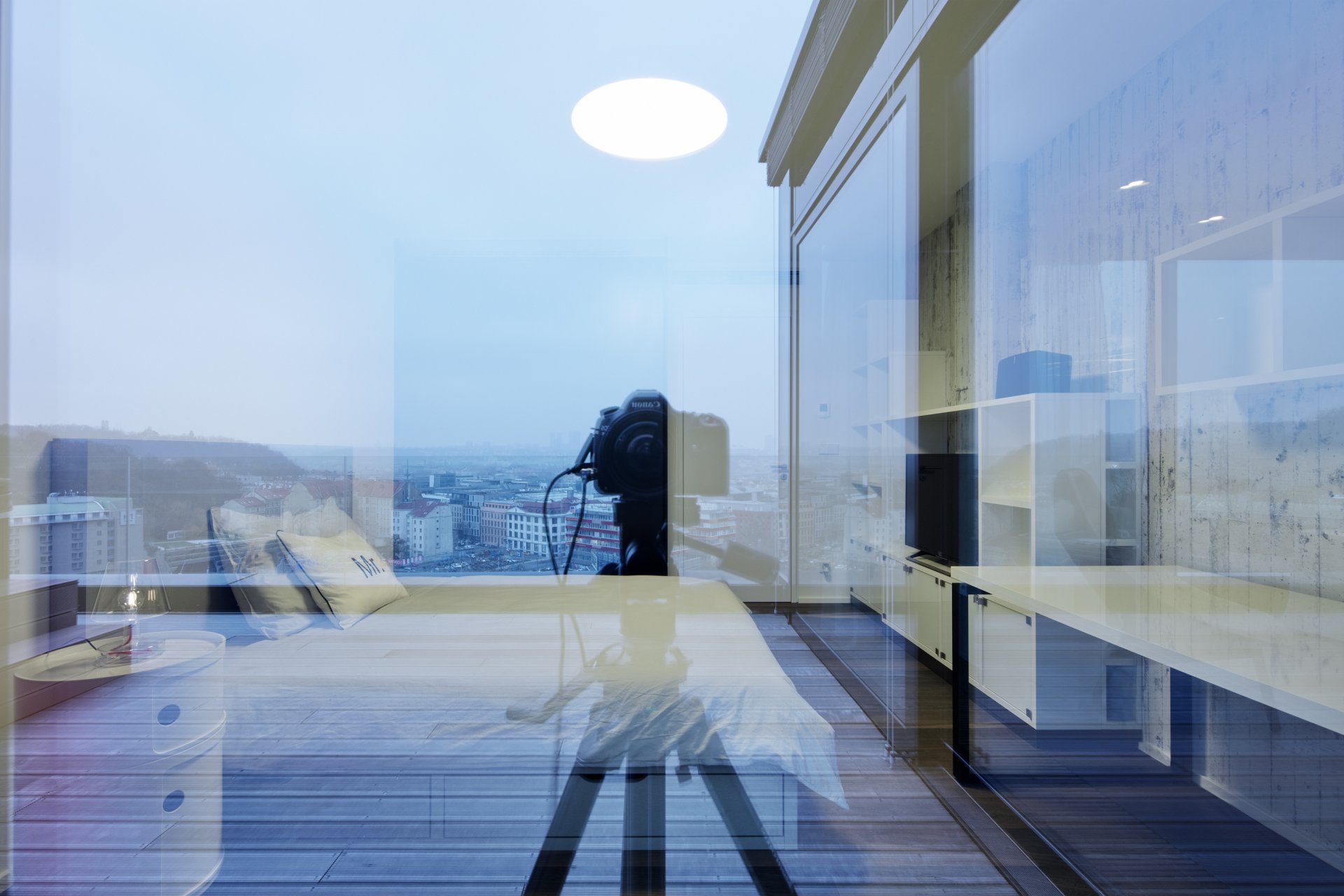 Hlavním benefitem celého bytu jsou nádherné výhledy a fasáda, která dá těmto výhledům vyniknout díky velké ploše prosklení. Exteriér celého města jakoby vniká do interiéru. Proto je dispozice obytné části navržena s maximálním důrazem na otevřenost. Hned od vstupních dveří tak vznikají překvapivé průhledy. Velké prosklené plochy fasády ale zároveň přinášejí problém s přehříváním v letních měsících. Tomu je zabráněno pomocí systému chlazení, který perforací v podhledu podél celé fasády nechá padat pomalý proud studeného vzduchu. Interiér tak není rušen mřížkami a zároveň ani hlukem chladících jednotek.