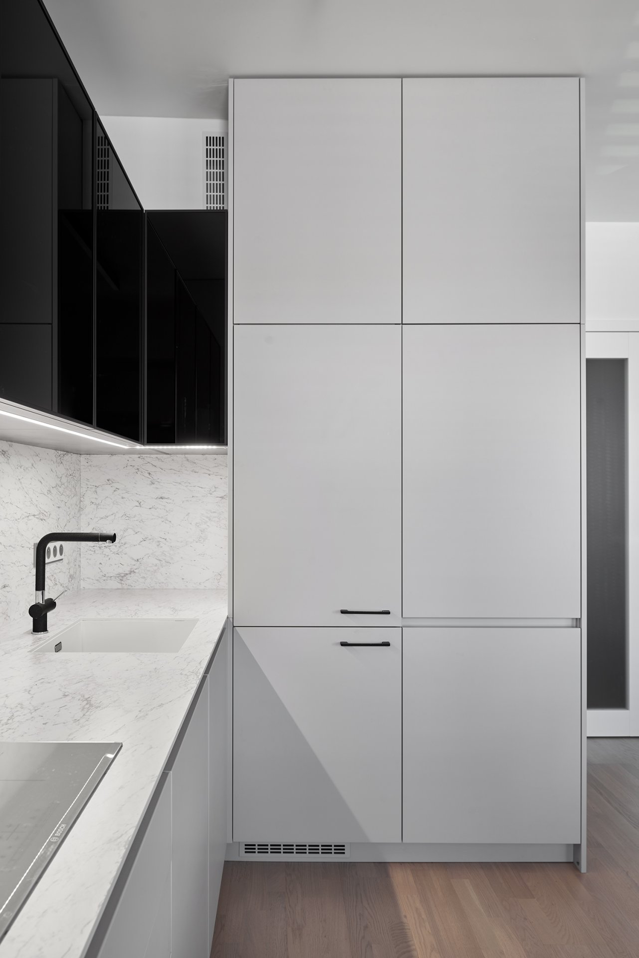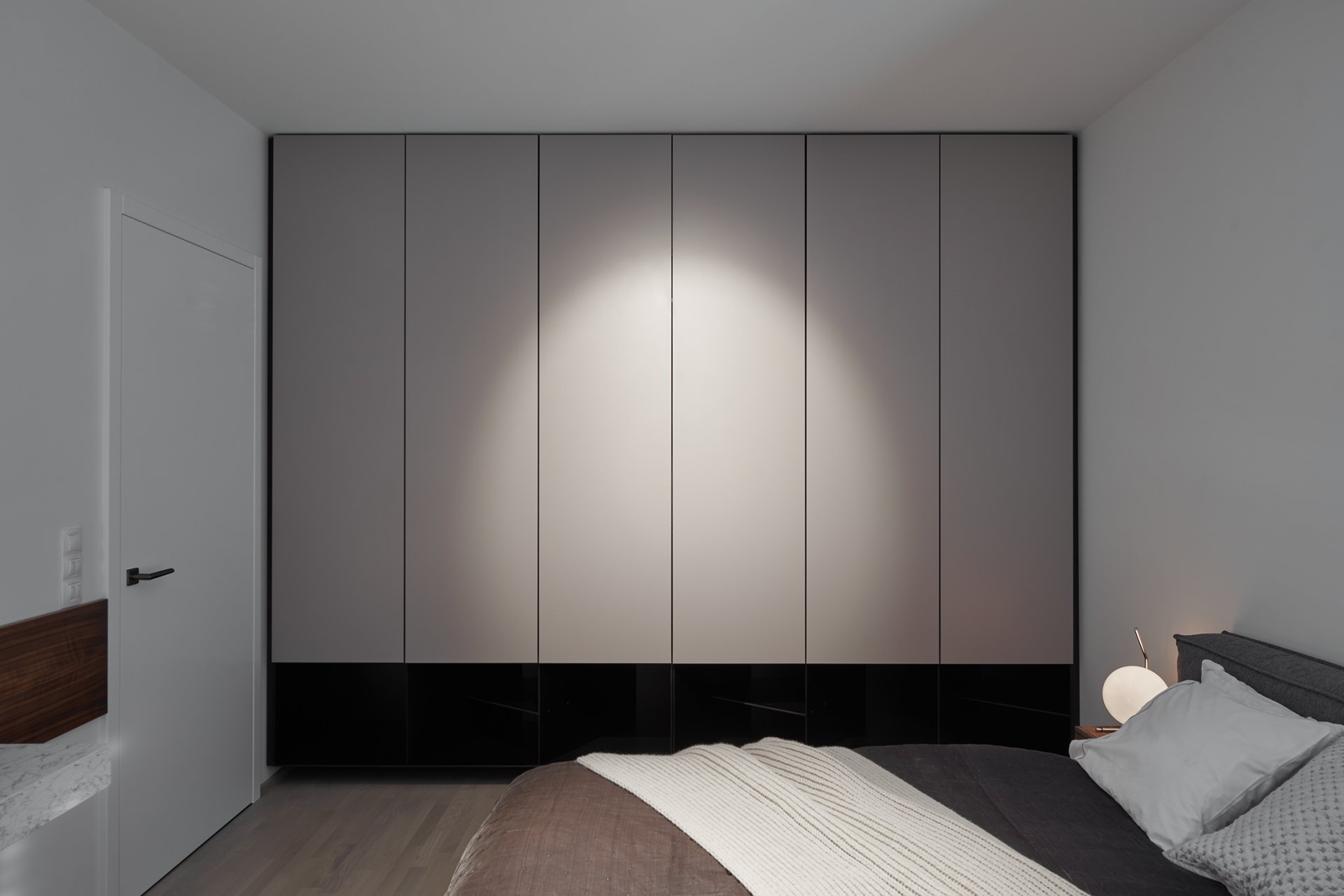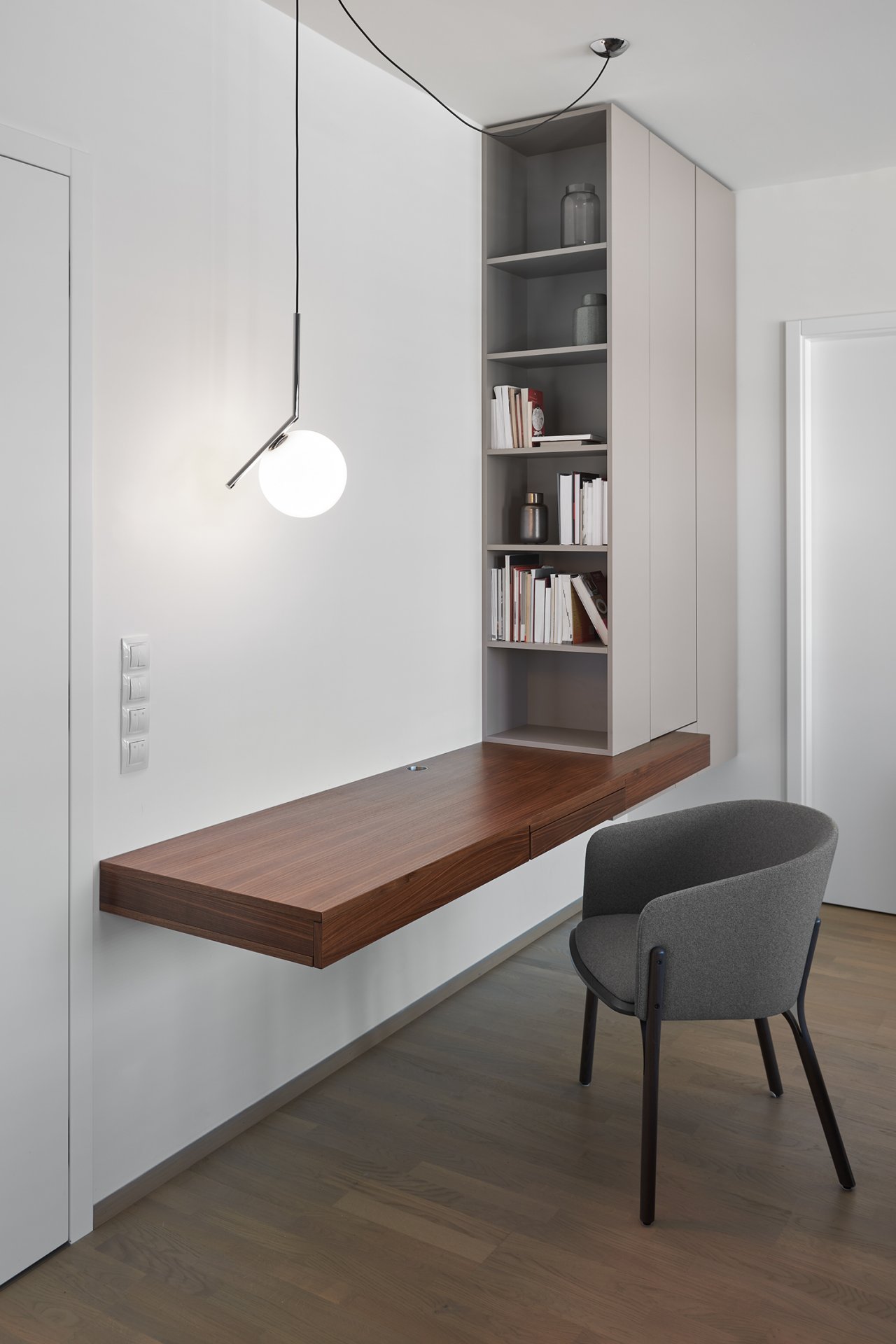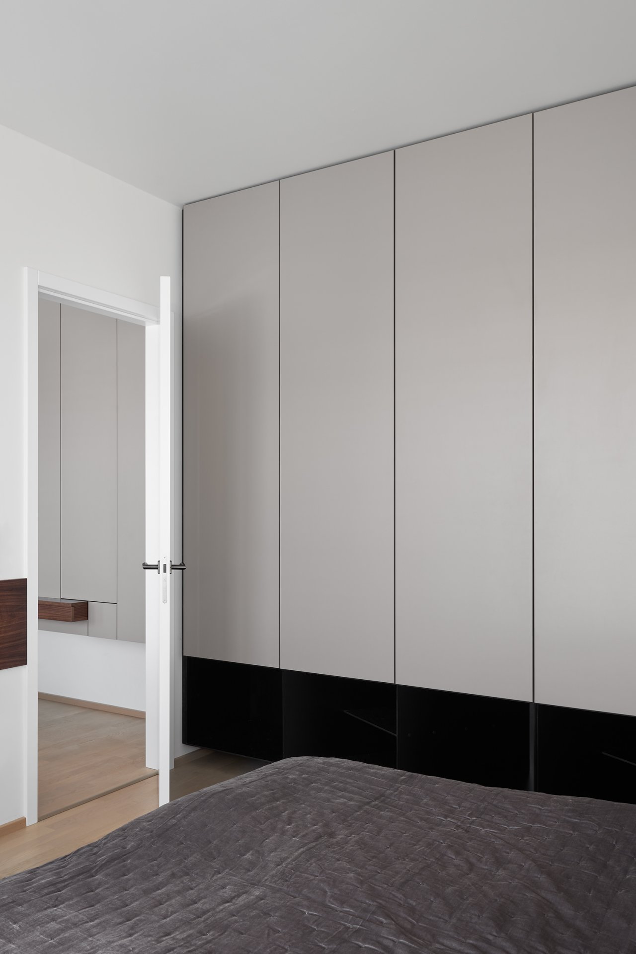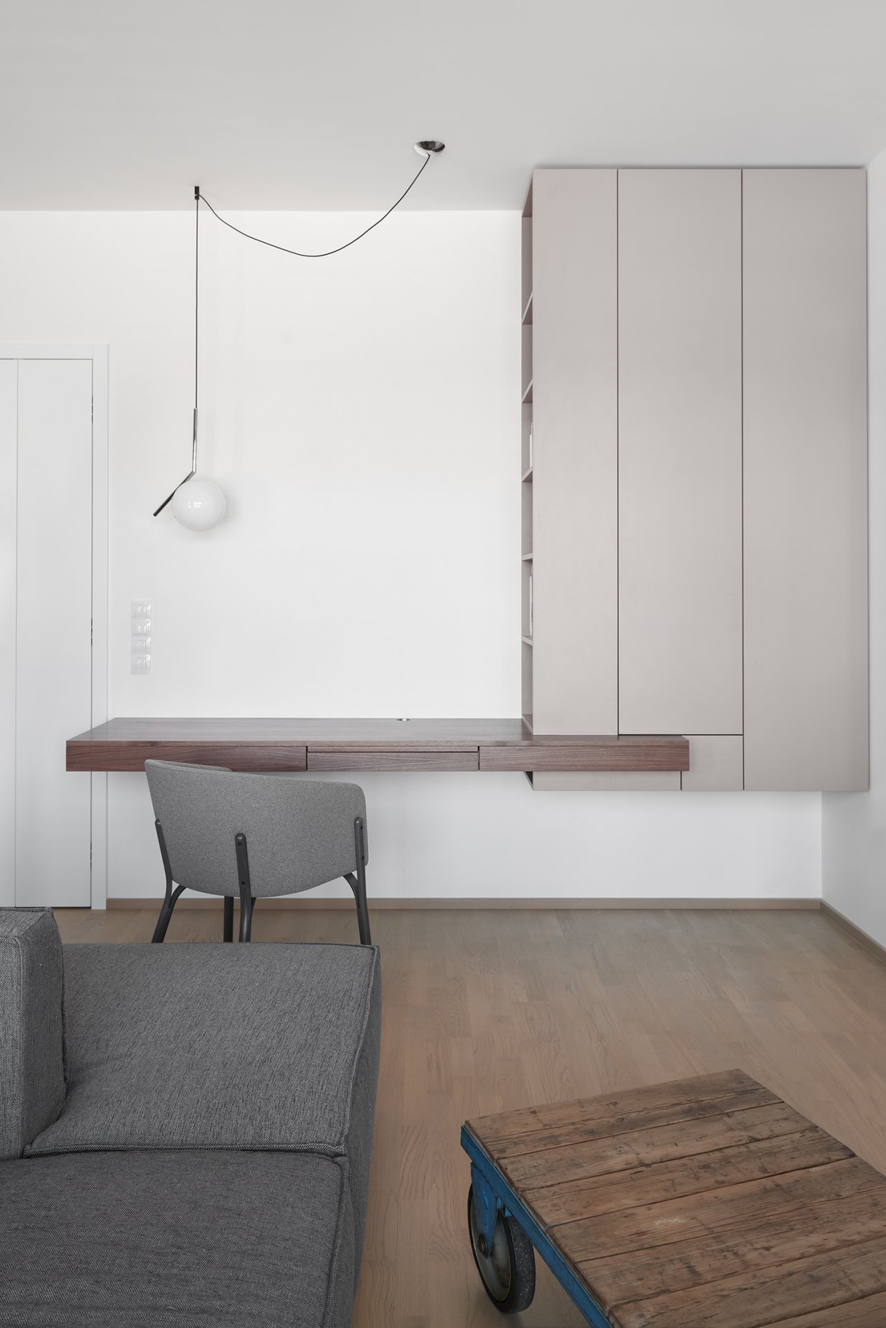 Malý byt v developerském projektu. Hlavním úkolem bylo vytvořit dostatek úložných prostor. Veškerý nábytek je tedy vestavěný, levituje a je ve stejných barevných tónech. Tak aby, navzdory prostorovým možnostem, byl celek vzdušný a harmonický.