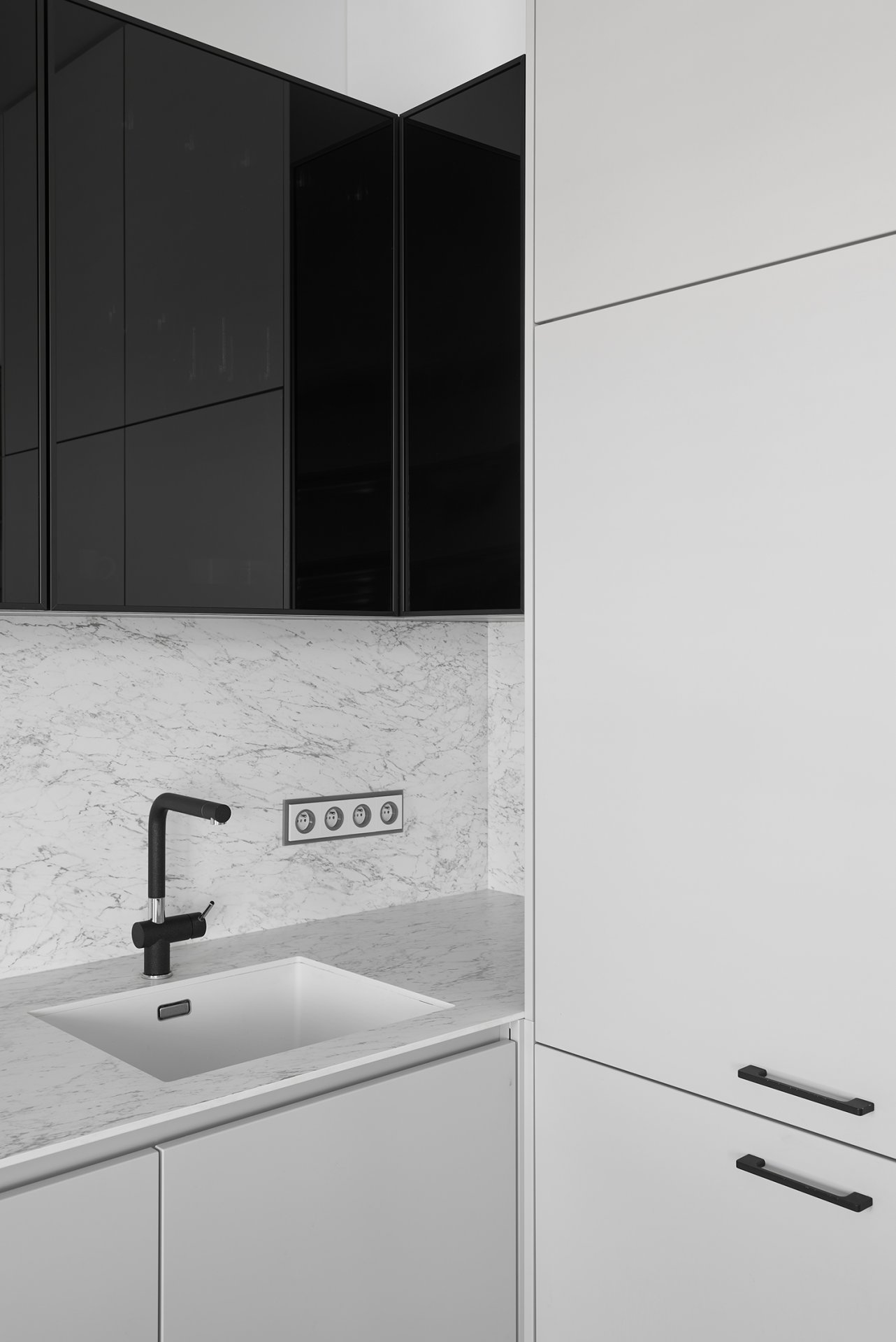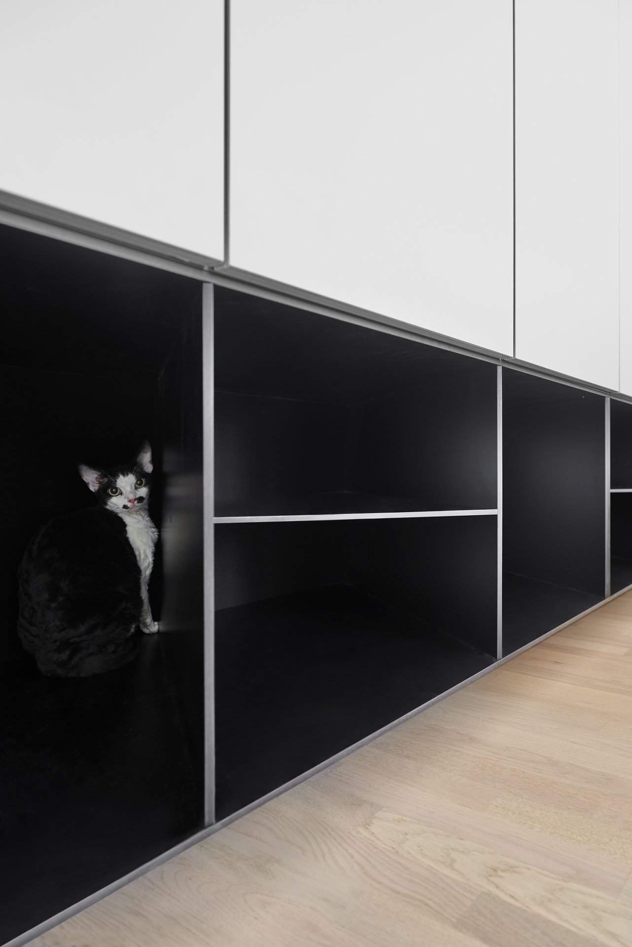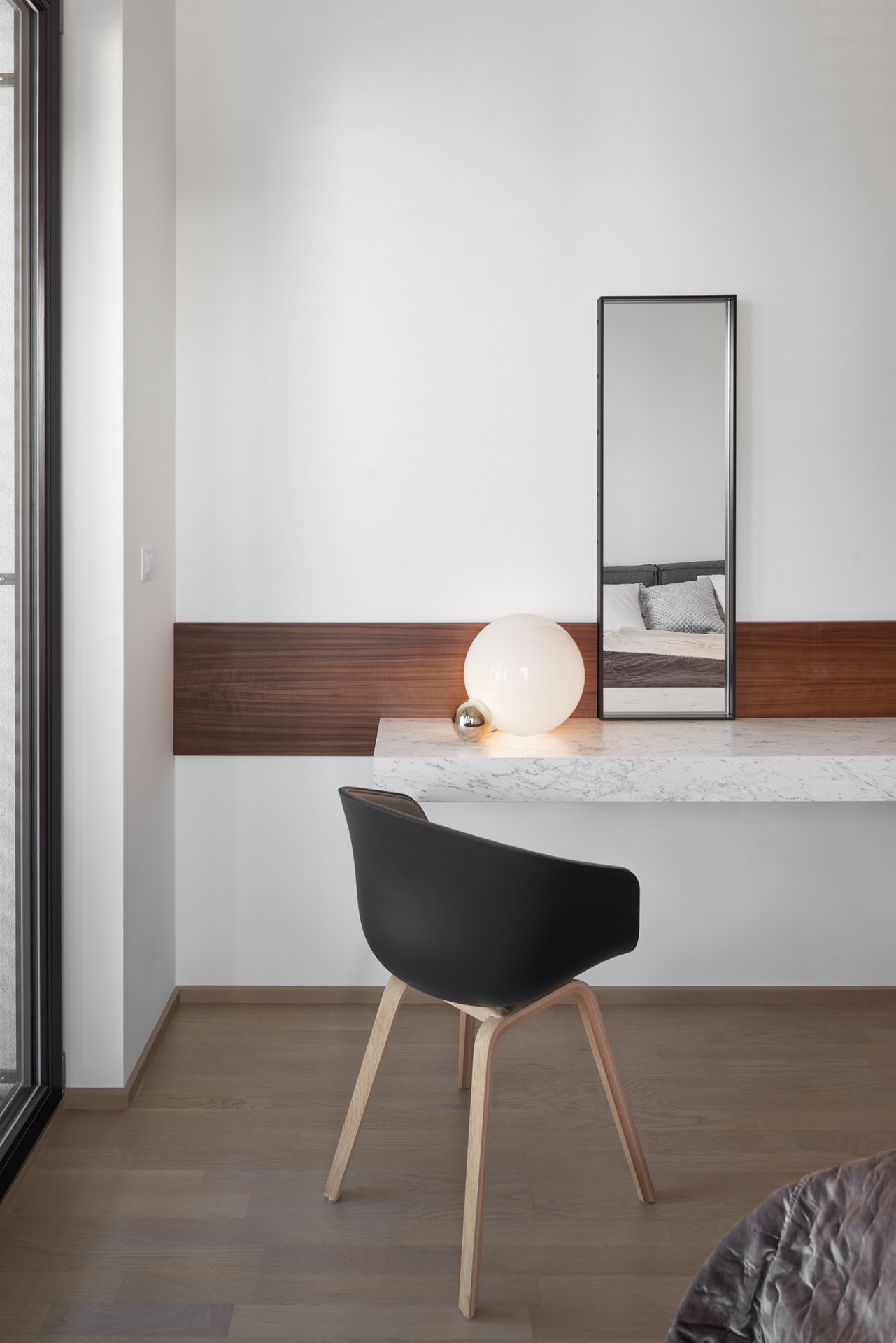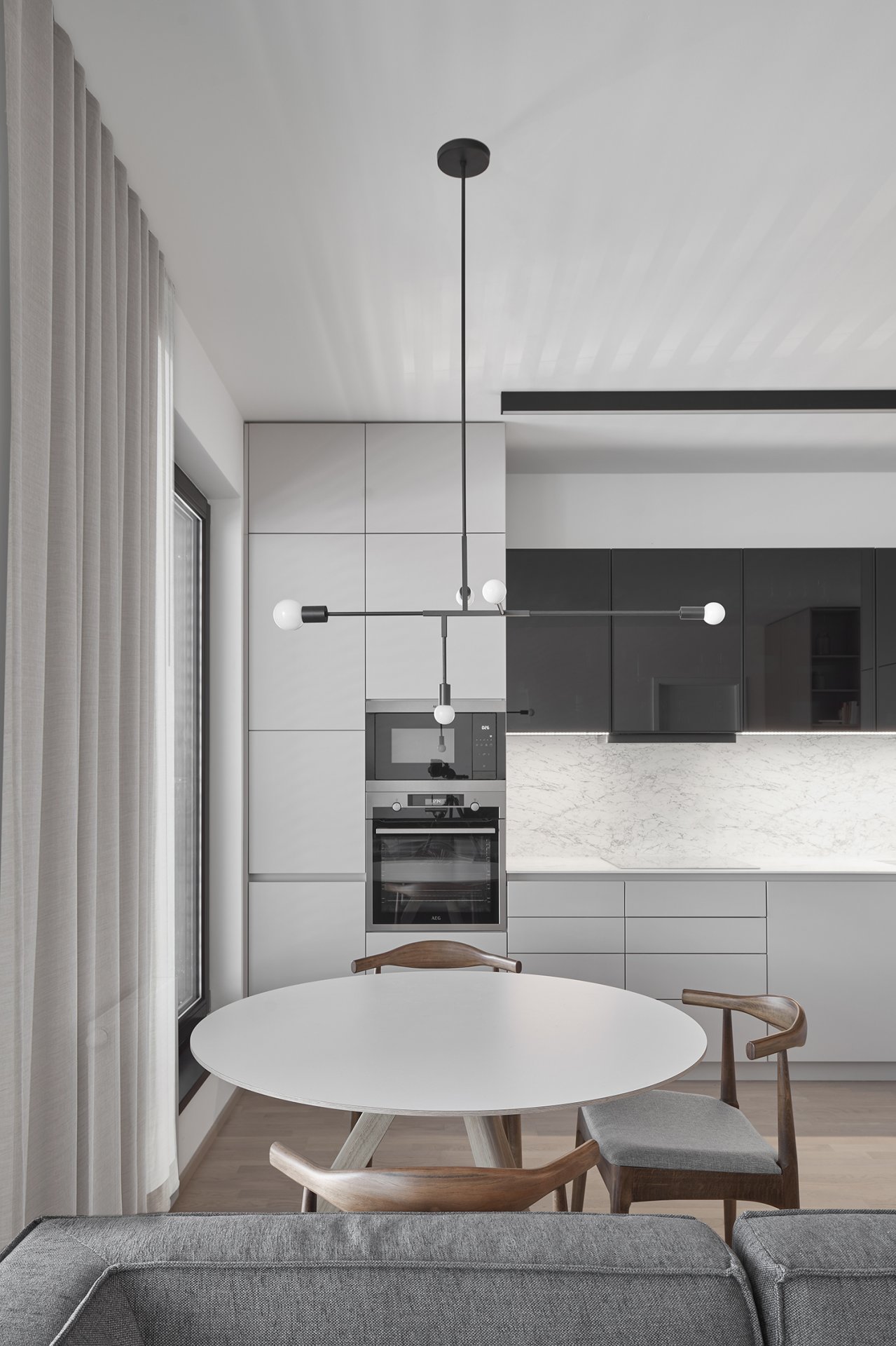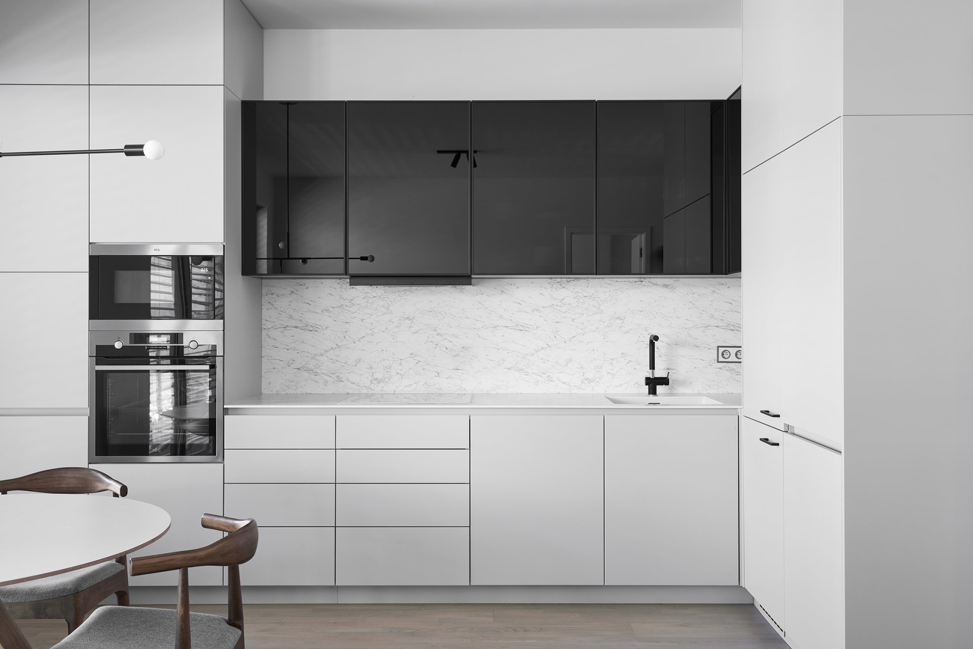 Malý byt v developerském projektu. Hlavním úkolem bylo vytvořit dostatek úložných prostor. Veškerý nábytek je tedy vestavěný, levituje a je ve stejných barevných tónech. Tak aby, navzdory prostorovým možnostem, byl celek vzdušný a harmonický.