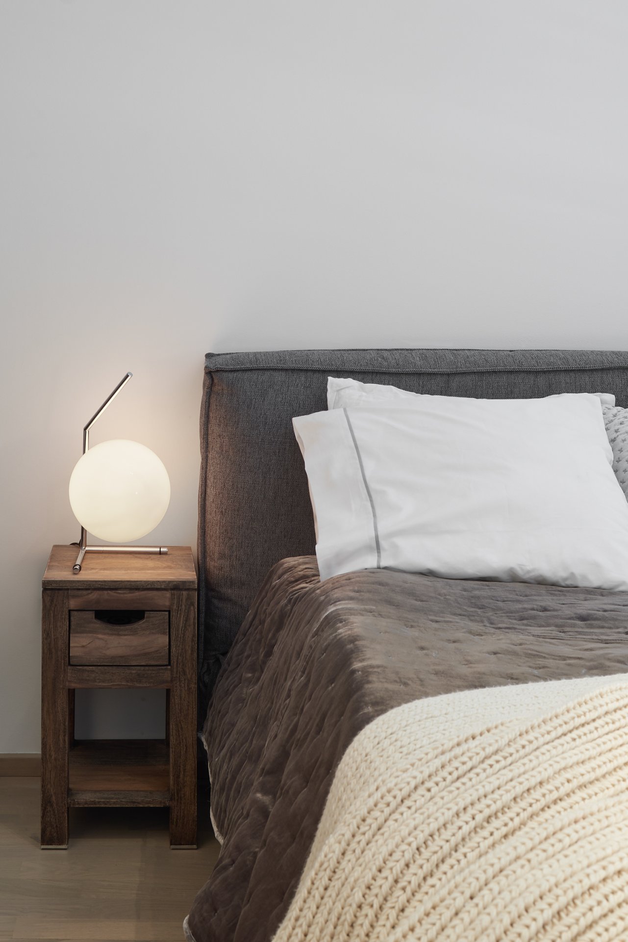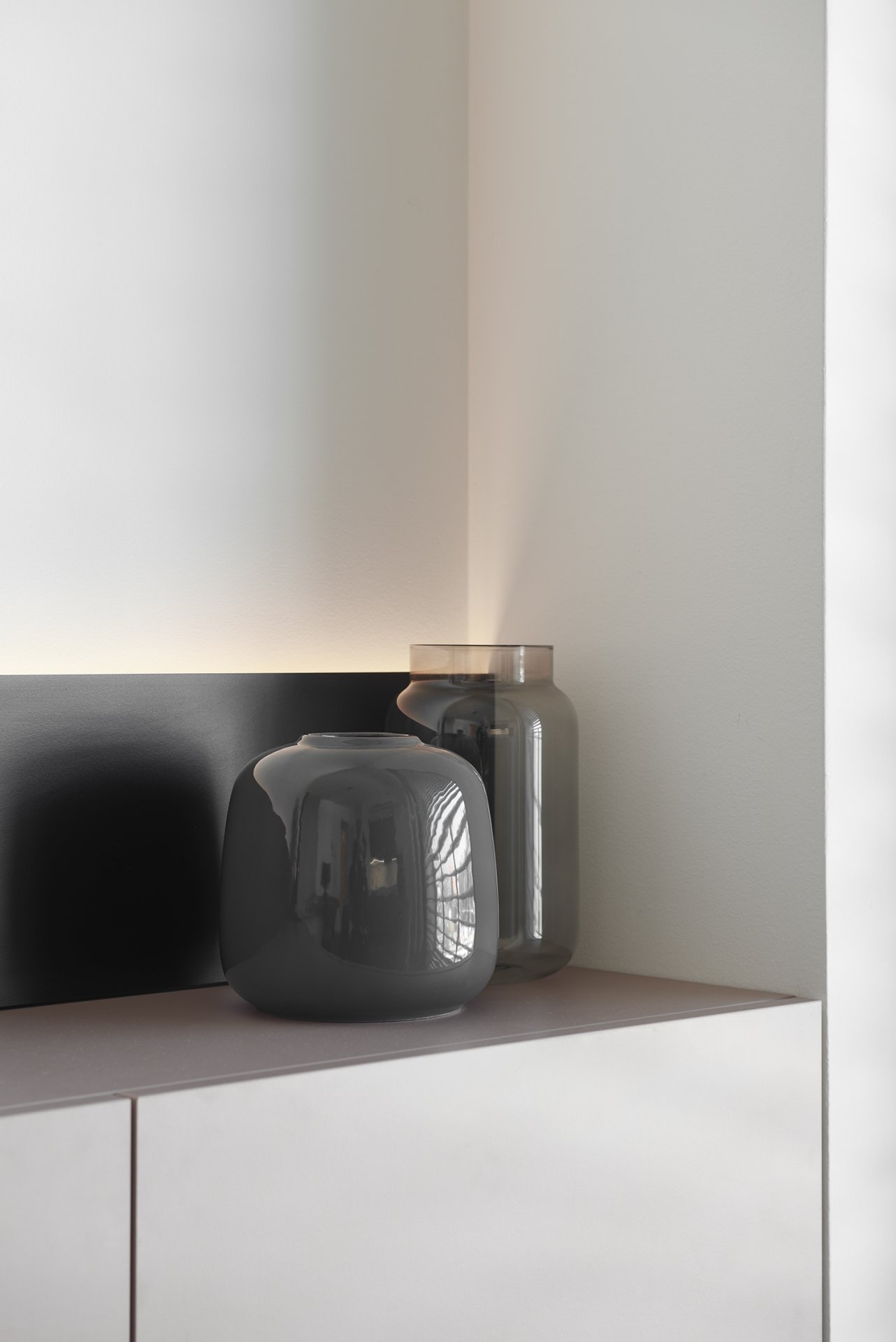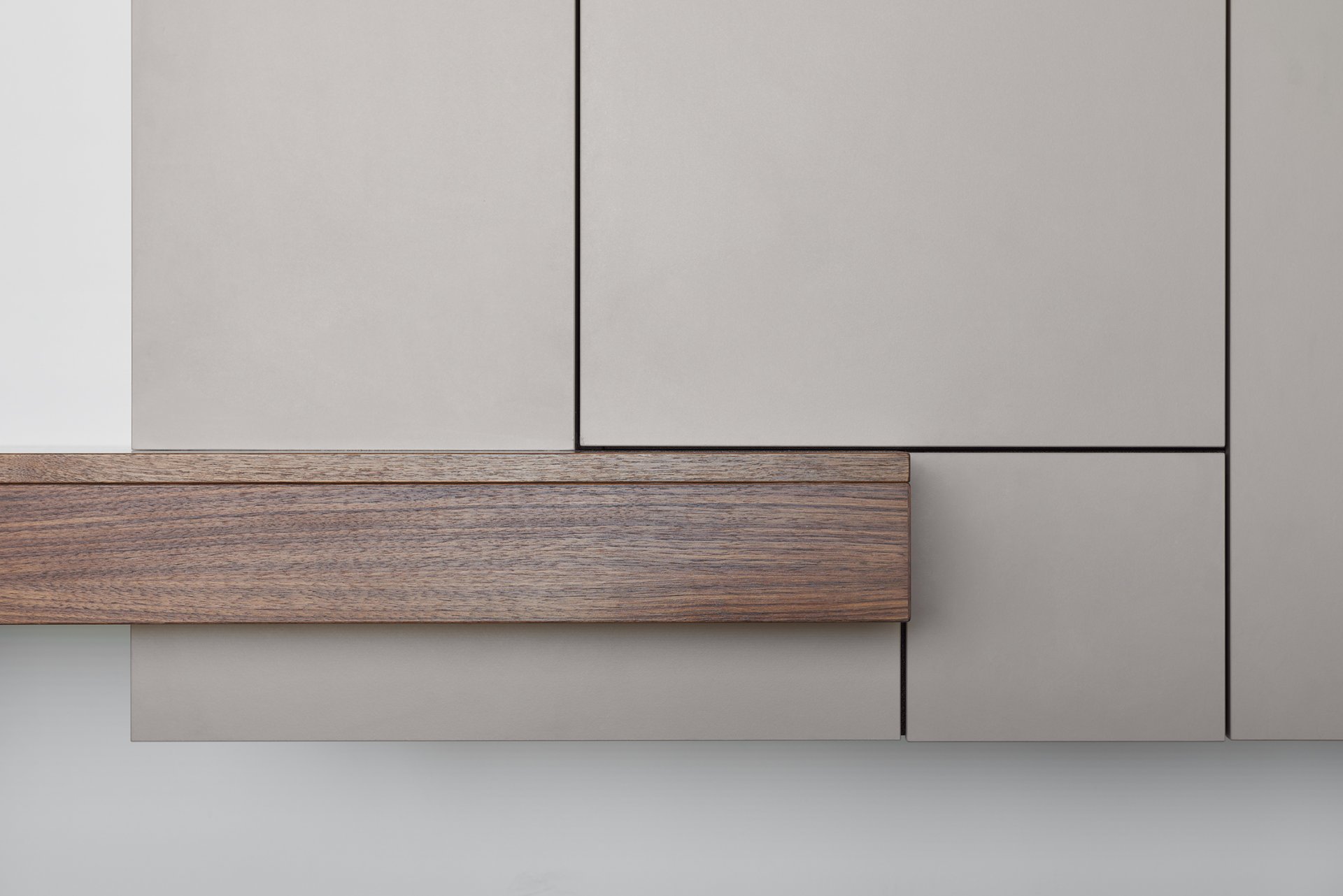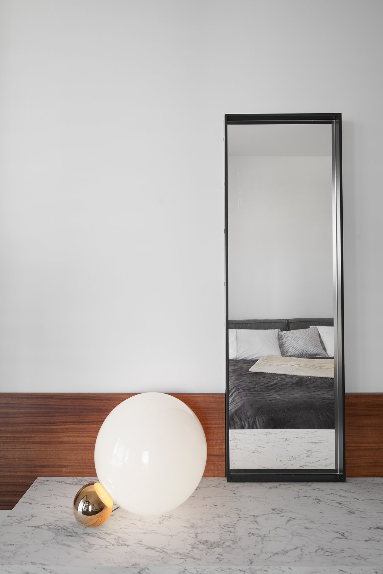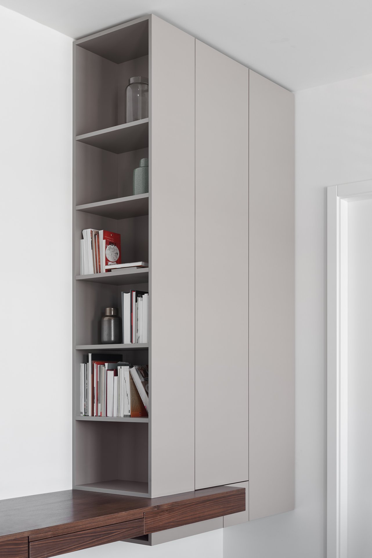 Malý byt v developerském projektu. Hlavním úkolem bylo vytvořit dostatek úložných prostor. Veškerý nábytek je tedy vestavěný, levituje a je ve stejných barevných tónech. Tak aby, navzdory prostorovým možnostem, byl celek vzdušný a harmonický.